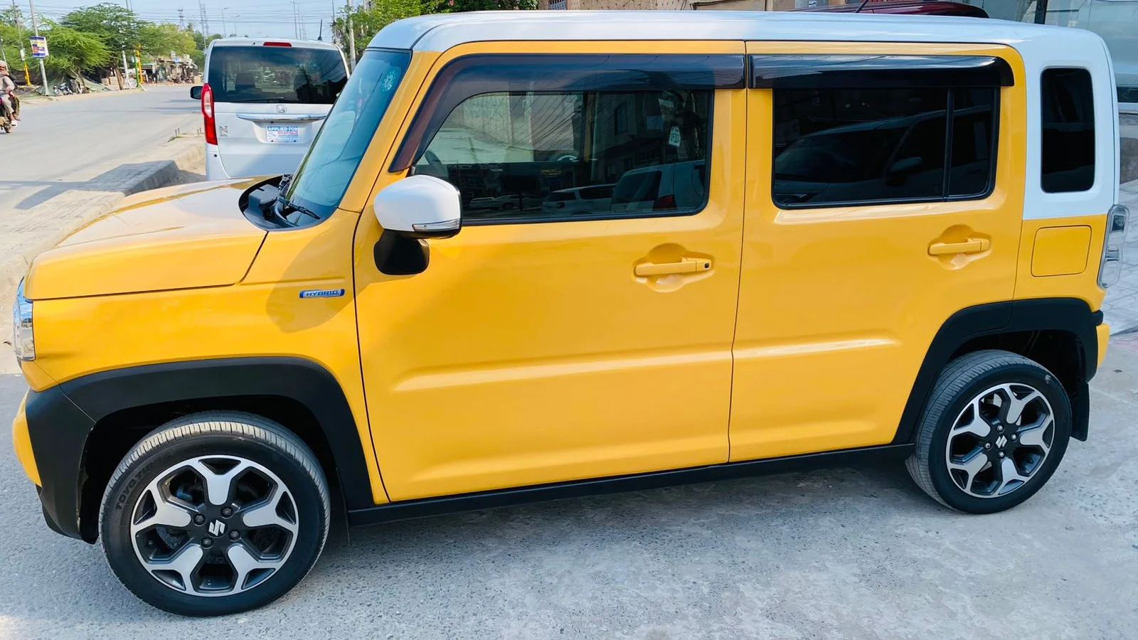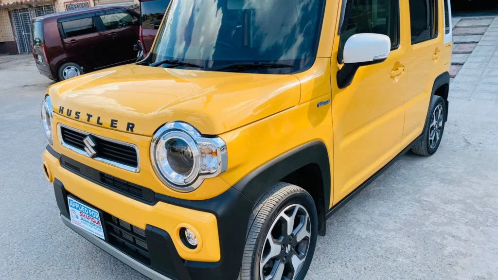 The Suzuki Hustler Turbo Hybrid 2021 in a striking two-tone Yellow and White is now available at Shafique Japan Motors, freshly imported in 2025 directly from Japan. This compact SUV-inspired kei car combines the power of a turbocharged 660cc hybrid engine with excellent fuel efficiency, making it an ideal choice for city commutes as well as weekend getaways. With 73,500 km mileage, automatic transmission, and a stylish yet comfortable interior, it offers both practicality and modern convenience. Key features include smart entry, push start, and a certified auction-verified grade, ensuring quality and reliability. Fully duty paid and ready to drive, this Hustler is available at an attractive price of PKR 4,050,000